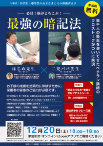 また、保護者の皆様が日常でどのように声をかけ、関わることで学習効果を高められるのか、すぐに実践できるサポート法もご紹介。さらにさらに!実際に暗記法を試した生徒のモニタリング結果を公開し、成果の再現性をその場でお確かめいただけるコーナーも企画中。お子さまが「覚えるって楽しい!」と感じられる学びへ。